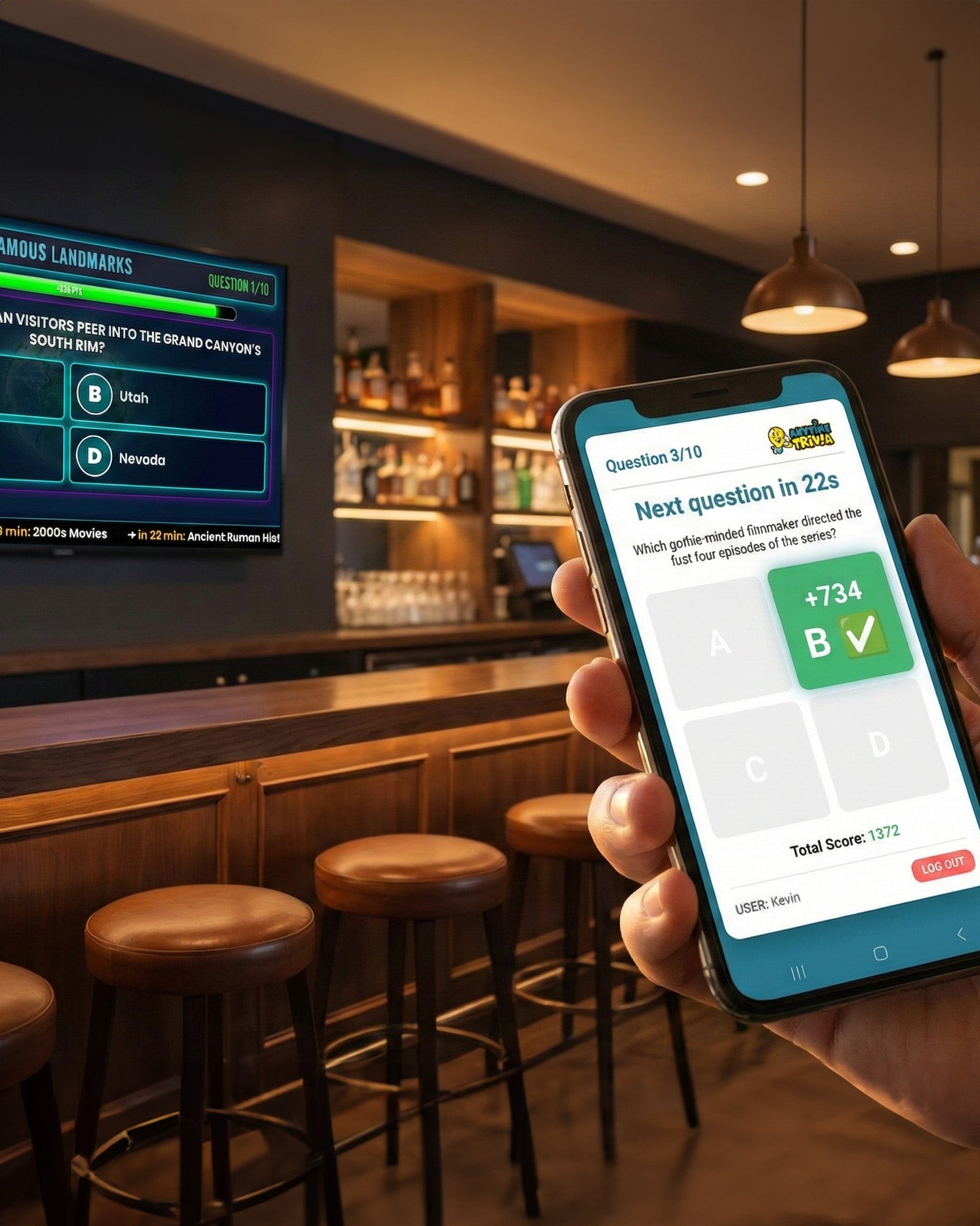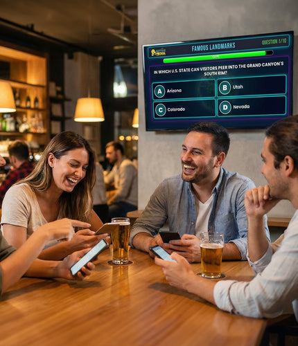 When guests can jump in instantly and compete together, they stay longer and come back more often. Trivia runs continuously, keeping energy high and giving people a reason to stick around - without extra work from your staff.
